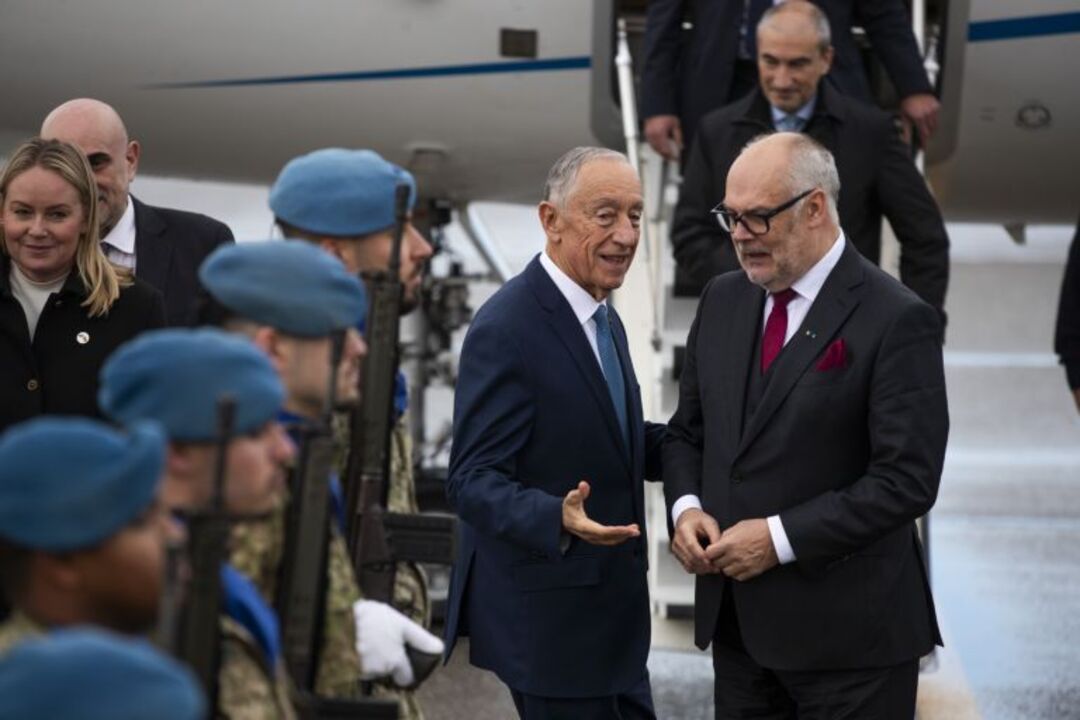 Estonia's President Alar Karis (R) accompanied by Portugal's President Marcelo Rebelo de Sousa (L) upon their arrival at Monte Real Air Base No. 5 to participate in a military ceremony to thank Portuguese Armed Forces (FAP) military personnel who were in Estonia, In Leiria, Portugal, 16 January 2026. PAULO CUNHA/LUSA