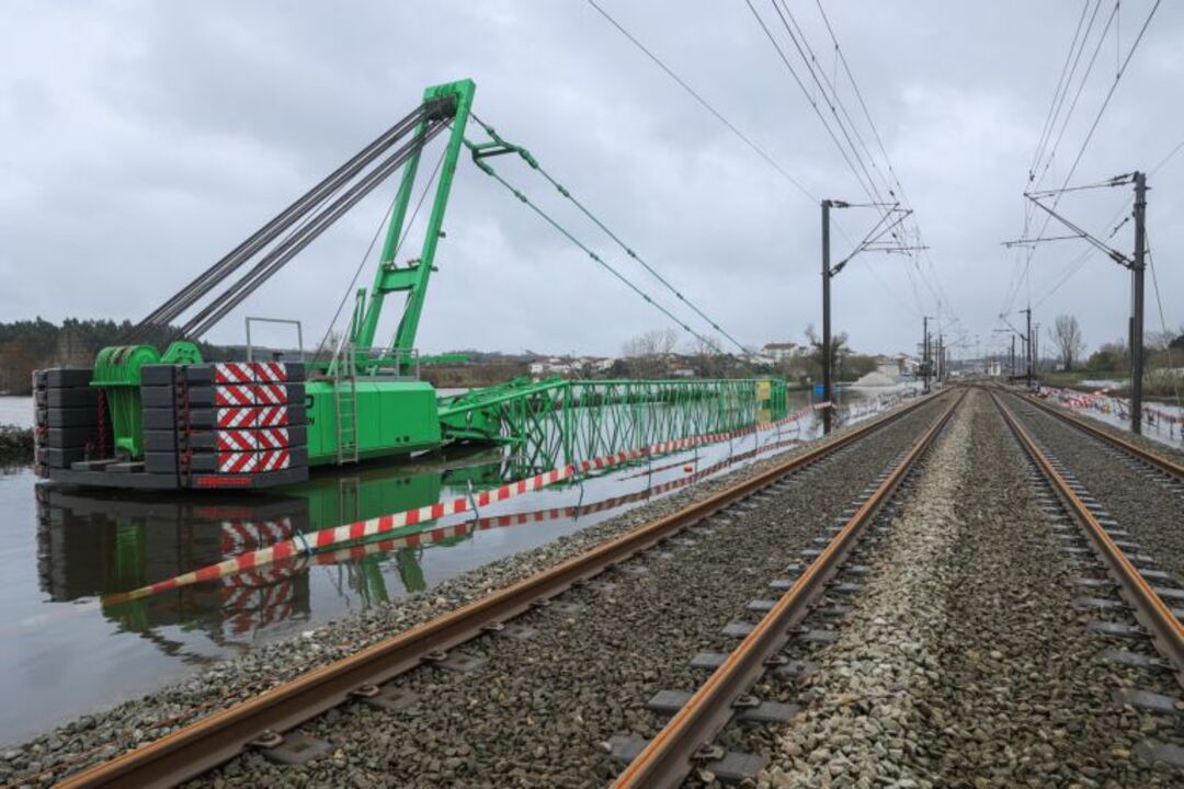 Part of the Northern Line, in the Montes de Formoselha area, Montemor-o-Velho, flooded due to bad weather, Portugal, 12 February 2026. No long-distance trains are expected to run on the Northern Line, with only regional services operating between Entroncamento and Soure, Coimbra-Aveiro-Porto and between Tomar and Lisbon. MIGUEL A. LOPES/LUSA