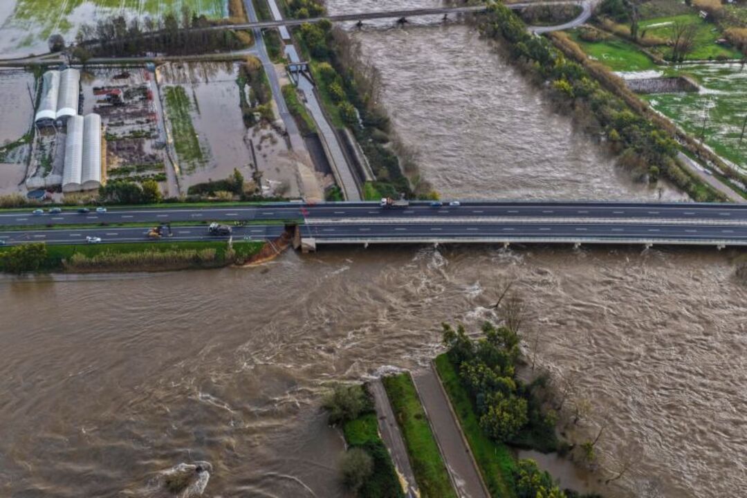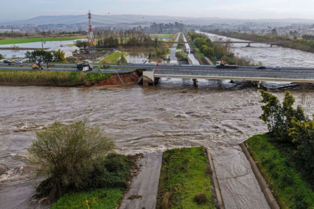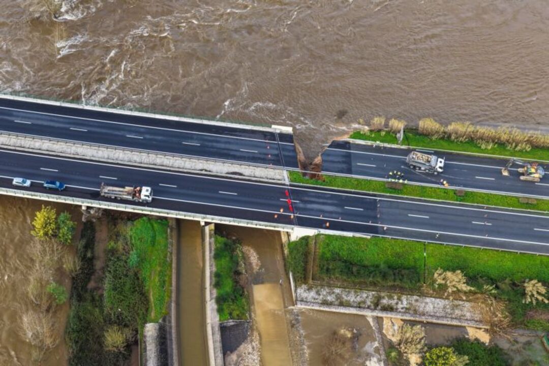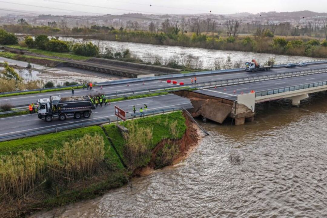 A section of Highway 1 (A1), the main highway connecting Lisbon to Porto, collapsed on Wednesday night following the breach of the Casais dam, following severe weather in Coimbra, Portugal, 12 February 2026. Sixteen people died in Portugal following the passage of storms Kristin, Leonardo, and Marta, which also left many hundreds injured and homeless. MIGUEL A. LOPES/LUSA