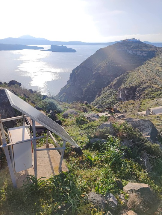 Santorini, Therasia and the islets of Nea and Palea Kameni have recently been "wired up" as part of an upgrade to the network of geodetic stations that monitor seismic activity and detect ground movements signaling new phases of seismic unrest. Cables, solar panels and surveying instruments resembling telescopes-used to measure angles and distances-now encircle the caldera, blending into the volcanic landscape while recording any changes that could indicate an emerging phenomenon.
