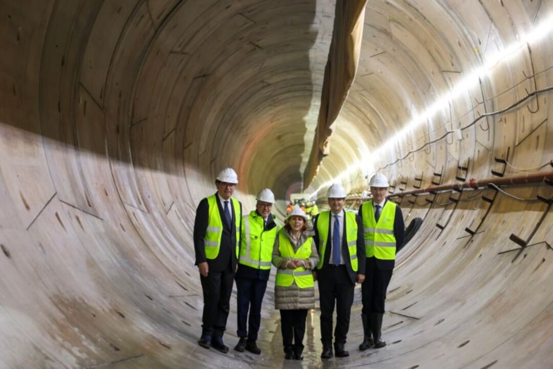 Portugal's Minister of Economy and Territorial Cohesion, Manuel Castro Almeida (L), accompanied by European Commission Vice-President for Cohesion and Reforms, Raffaele Fitto (2-R), by the Minister of the Environment and Energy, Maria da Graça Carvalho (C), by the Mayor of Lisbon, Carlos Moedas (2-L), and by the Secretary of State for Planning and Regional Development, Hélder Reis (R), during a visit to the construction site of the tunnels for the Lisbon General Drainage Plan in Lisbon, Portugal, 08 April 2026. ANTÓNIO COTRIM/LUSA